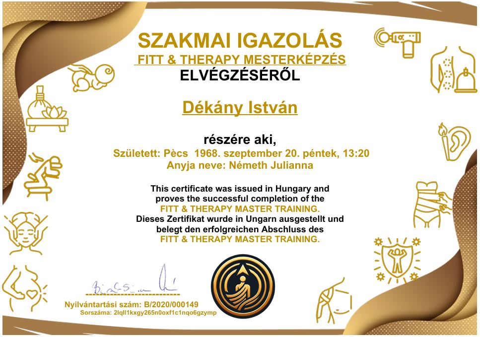 Dékány István, okleveles masszőr vagyok, aki segíti a pihenésre, fájdalomcsillapításra és a testi-lelki regenerálódásra vágyókat. Szakmai képzettségemet elismert iskolában szereztem, és azóta folyamatosan bővítem tudásomat a legújabb masszázs technikák és terápiák terén. Célom, hogy minden vendégem a legmagasabb szintű kezelést kapja, amelyet teljes figyelemmel és a legnagyobb körültekintéssel végzek.
